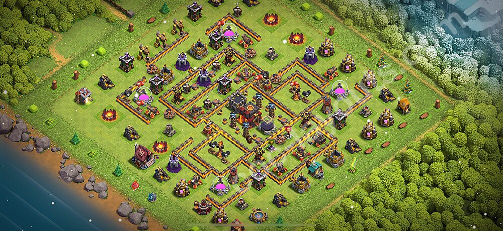 This Town Hall 10 war base is specifically designed to defend against 2-star and 3-star attacks in Clan Wars and Clan War Leagues. The strategic placement of defenses creates multiple compartments that force attackers to use more troops and spells than anticipated. Key defensive structures like Eagle Artillery, Inferno Towers, and X-Bows are positioned to cover crucial sections of the base, making it extremely difficult for opponents to secure a perfect attack. The core of this war base features a centralized Town Hall and Clan Castle, protected by multiple layers of walls and high-damage defenses. This layout forces attackers to commit significant resources just to reach the center, often leaving them without enough firepower to secure the Town Hall destruction. The anti-2-star design ensures that even if attackers breach the outer defenses, they'll struggle to achieve a 50% destruction rating. Air defenses are strategically spread to counter popular air attack strategies like LaLoon (Lava Hound + Balloons) and Electrone (Electro Dragons + Stone Slammer). The symmetrical trap placement and strategic Hidden Tesla positions create deadly surprise elements that can completely derail an attacker's plan. This base has been tested against various meta attack strategies and has consistently proven effective in preventing 3-star attacks.