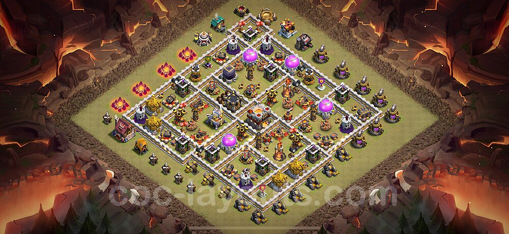 This Town Hall 11 hybrid base offers the best of both worlds - strong resource protection combined with effective trophy defense. The versatile design makes it an excellent choice for players who want to protect their loot while maintaining their trophy count. This balanced approach ensures you don't sacrifice one aspect of defense for another, making it ideal for active players across all league levels. The hybrid layout features centralized resource storages alongside a well-protected Town Hall, with multiple defensive layers that deter both farming raids and trophy pushers. High-value targets are strategically positioned within overlapping defense ranges, forcing attackers to make difficult choices about which objectives to prioritize. The compartmentalized design prevents attackers from easily achieving both loot destruction and the Town Hall kill in a single attack. Defense placement in this hybrid base creates strong coverage against both ground and air attacks. Inferno Towers, X-Bows, and Eagle Artillery work in concert to eliminate threats quickly, while splash damage defenses like Wizard Towers and Bomb Towers counter swarm strategies. The base's funnel-resistant design and strategic trap placement make it effective against popular attack strategies including QC LaLoon (Queen Charge Lava Hound Balloon), Blizzard attacks, and Yeti Smash compositions.