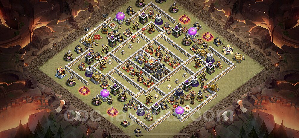 This Town Hall 11 war base is specifically designed to defend against 2-star and 3-star attacks in Clan Wars and Clan War Leagues. The strategic placement of defenses creates multiple compartments that force attackers to use more troops and spells than anticipated. Key defensive structures like Eagle Artillery, Inferno Towers, and X-Bows are positioned to cover crucial sections of the base, making it extremely difficult for opponents to secure a perfect attack. The core of this war base features a centralized Town Hall and Clan Castle, protected by multiple layers of walls and high-damage defenses. This layout forces attackers to commit significant resources just to reach the center, often leaving them without enough firepower to secure the Town Hall destruction. The anti-2-star design ensures that even if attackers breach the outer defenses, they'll struggle to achieve a 50% destruction rating. Air defenses are strategically spread to counter popular air attack strategies like LaLoon (Lava Hound + Balloons) and Electrone (Electro Dragons + Stone Slammer). The symmetrical trap placement and strategic Hidden Tesla positions create deadly surprise elements that can completely derail an attacker's plan. This base has been tested against various meta attack strategies and has consistently proven effective in preventing 3-star attacks.