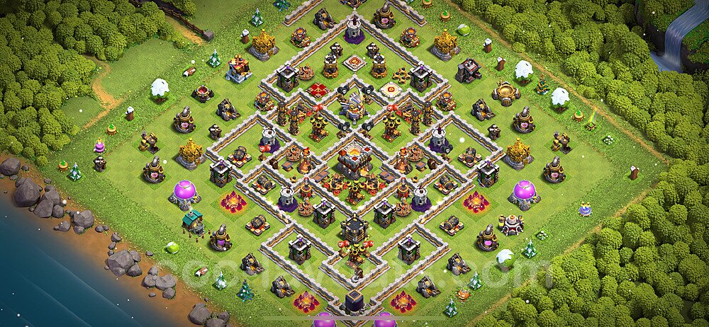 This Town Hall 11 war base is specifically designed to defend against 2-star and 3-star attacks in Clan Wars and Clan War Leagues. The strategic placement of defenses creates multiple compartments that force attackers to use more troops and spells than anticipated. Key defensive structures like Eagle Artillery, Inferno Towers, and X-Bows are positioned to cover crucial sections of the base, making it extremely difficult for opponents to secure a perfect attack. The core of this war base features a centralized Town Hall and Clan Castle, protected by multiple layers of walls and high-damage defenses. This layout forces attackers to commit significant resources just to reach the center, often leaving them without enough firepower to secure the Town Hall destruction. The anti-2-star design ensures that even if attackers breach the outer defenses, they'll struggle to achieve a 50% destruction rating. Air defenses are strategically spread to counter popular air attack strategies like LaLoon (Lava Hound + Balloons) and Electrone (Electro Dragons + Stone Slammer). The symmetrical trap placement and strategic Hidden Tesla positions create deadly surprise elements that can completely derail an attacker's plan. This base has been tested against various meta attack strategies and has consistently proven effective in preventing 3-star attacks.