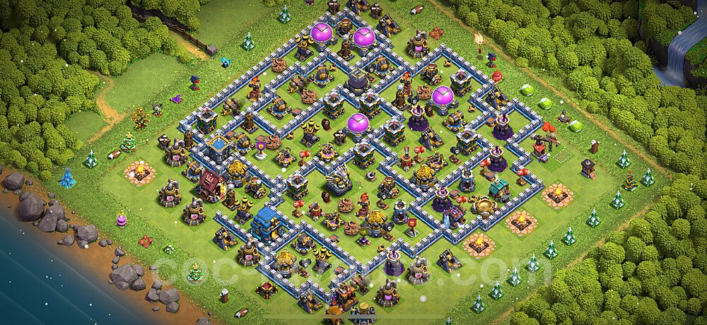 This Town Hall 12 farming base is optimized to protect your resources including Gold, Elixir, and Dark Elixir from raiders. The layout features centralized storages with multiple compartments that make it extremely difficult for attackers to steal large amounts of resources in a single raid. This design philosophy prioritizes resource protection over trophies, making it ideal for players focused on upgrading their village. The strategic placement of resource storages ensures they are well-protected by high-damage defenses like X-Bows, Inferno Towers, and Eagle Artillery. Each storage is surrounded by multiple wall layers and defensive structures, forcing attackers to invest heavily in troops and spells to reach your loot. The farming base design also incorporates strategic dead zones where attackers' troops tend to path inefficiently, wasting time and taking heavy damage from nearby defenses. Collectors and mines are positioned on the outer edges as "bait" while your main storages remain heavily protected in the core. This layout has proven effective against common farming strategies like BARCH (Barbarians + Archers), GoWiPe (Golems + Wizards + Pekka), and mass Miner attacks. The compartmentalized design prevents attackers from funneling straight to your resources, ensuring you maintain your hard-earned loot for important upgrades.
