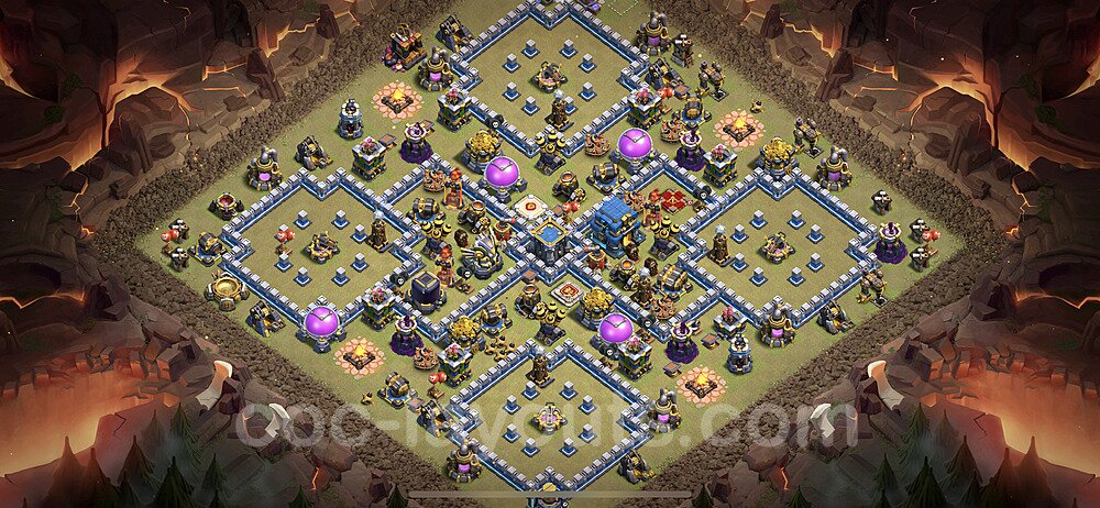 This Town Hall 12 war base is specifically designed to defend against 2-star and 3-star attacks in Clan Wars and Clan War Leagues. The strategic placement of defenses creates multiple compartments that force attackers to use more troops and spells than anticipated. Key defensive structures like Eagle Artillery, Inferno Towers, and X-Bows are positioned to cover crucial sections of the base, making it extremely difficult for opponents to secure a perfect attack. The core of this war base features a centralized Town Hall and Clan Castle, protected by multiple layers of walls and high-damage defenses. This layout forces attackers to commit significant resources just to reach the center, often leaving them without enough firepower to secure the Town Hall destruction. The anti-2-star design ensures that even if attackers breach the outer defenses, they'll struggle to achieve a 50% destruction rating. Air defenses are strategically spread to counter popular air attack strategies like LaLoon (Lava Hound + Balloons) and Electrone (Electro Dragons + Stone Slammer). The symmetrical trap placement and strategic Hidden Tesla positions create deadly surprise elements that can completely derail an attacker's plan. This base has been tested against various meta attack strategies and has consistently proven effective in preventing 3-star attacks.