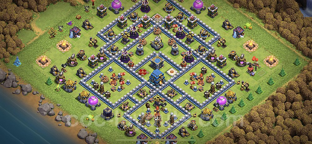 This Town Hall 12 war base is specifically designed to defend against 2-star and 3-star attacks in Clan Wars and Clan War Leagues. The strategic placement of defenses creates multiple compartments that force attackers to use more troops and spells than anticipated. Key defensive structures like Eagle Artillery, Inferno Towers, and X-Bows are positioned to cover crucial sections of the base, making it extremely difficult for opponents to secure a perfect attack. The core of this war base features a centralized Town Hall and Clan Castle, protected by multiple layers of walls and high-damage defenses. This layout forces attackers to commit significant resources just to reach the center, often leaving them without enough firepower to secure the Town Hall destruction. The anti-2-star design ensures that even if attackers breach the outer defenses, they'll struggle to achieve a 50% destruction rating. Air defenses are strategically spread to counter popular air attack strategies like LaLoon (Lava Hound + Balloons) and Electrone (Electro Dragons + Stone Slammer). The symmetrical trap placement and strategic Hidden Tesla positions create deadly surprise elements that can completely derail an attacker's plan. This base has been tested against various meta attack strategies and has consistently proven effective in preventing 3-star attacks.