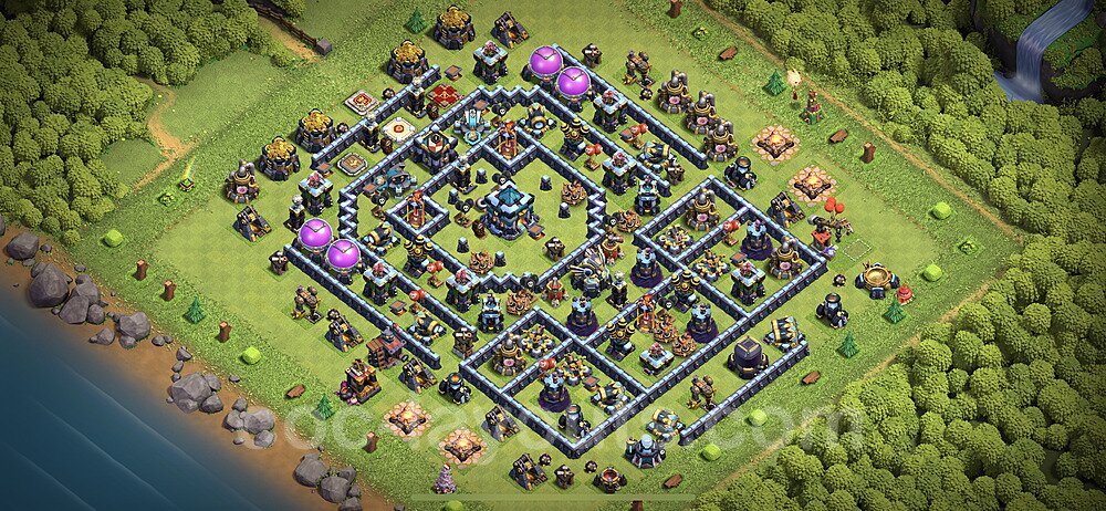 This Town Hall 13 trophy pushing base is engineered for maximum defensive capability to help you climb and maintain higher trophy leagues. The design focuses on preventing attackers from achieving the 50% destruction threshold needed to steal trophies, with a heavily fortified Town Hall position and anti-2-star compartmentalization. This layout is perfect for competitive players aiming to reach Champion, Titan, or Legend League. The strategic placement of defenses creates overlapping coverage that makes it nearly impossible for attackers to access the core without facing devastating firepower. High-DPS defenses like Inferno Towers and Eagle Artillery are positioned to protect the Town Hall from all angles, while splash damage defenses counter mass troop strategies. The anti-air coverage is exceptionally strong, with Air Defenses, Air Sweepers, and Wizard Towers positioned to eliminate aerial threats quickly. Trap placement in this trophy base is optimized to counter popular attack strategies seen in higher leagues. Spring Traps are positioned to eliminate Hog Riders and Valkyries, while Giant Bombs target Balloons and Wall Breakers. The base's asymmetrical design confuses attackers' pathing algorithms, causing troops to split and take unnecessary damage. This layout has been battle-tested in Legend League and has consistently helped players maintain their trophies against skilled attackers.
