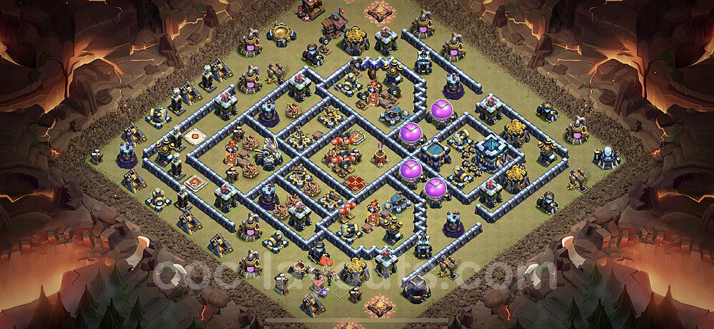 This Town Hall 13 war base is specifically designed to defend against 2-star and 3-star attacks in Clan Wars and Clan War Leagues. The strategic placement of defenses creates multiple compartments that force attackers to use more troops and spells than anticipated. Key defensive structures like Eagle Artillery, Inferno Towers, and X-Bows are positioned to cover crucial sections of the base, making it extremely difficult for opponents to secure a perfect attack. The core of this war base features a centralized Town Hall and Clan Castle, protected by multiple layers of walls and high-damage defenses. This layout forces attackers to commit significant resources just to reach the center, often leaving them without enough firepower to secure the Town Hall destruction. The anti-2-star design ensures that even if attackers breach the outer defenses, they'll struggle to achieve a 50% destruction rating. Air defenses are strategically spread to counter popular air attack strategies like LaLoon (Lava Hound + Balloons) and Electrone (Electro Dragons + Stone Slammer). The symmetrical trap placement and strategic Hidden Tesla positions create deadly surprise elements that can completely derail an attacker's plan. This base has been tested against various meta attack strategies and has consistently proven effective in preventing 3-star attacks.