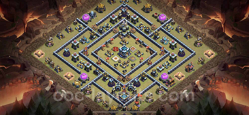 This Town Hall 13 war base is specifically designed to defend against 2-star and 3-star attacks in Clan Wars and Clan War Leagues. The strategic placement of defenses creates multiple compartments that force attackers to use more troops and spells than anticipated. Key defensive structures like Eagle Artillery, Inferno Towers, and X-Bows are positioned to cover crucial sections of the base, making it extremely difficult for opponents to secure a perfect attack. The core of this war base features a centralized Town Hall and Clan Castle, protected by multiple layers of walls and high-damage defenses. This layout forces attackers to commit significant resources just to reach the center, often leaving them without enough firepower to secure the Town Hall destruction. The anti-2-star design ensures that even if attackers breach the outer defenses, they'll struggle to achieve a 50% destruction rating. Air defenses are strategically spread to counter popular air attack strategies like LaLoon (Lava Hound + Balloons) and Electrone (Electro Dragons + Stone Slammer). The symmetrical trap placement and strategic Hidden Tesla positions create deadly surprise elements that can completely derail an attacker's plan. This base has been tested against various meta attack strategies and has consistently proven effective in preventing 3-star attacks.