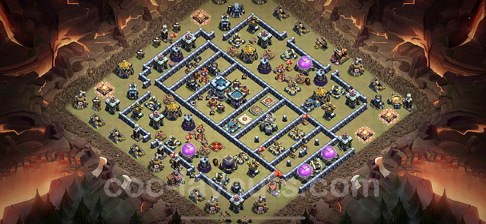 This Town Hall 13 war base is specifically designed to defend against 2-star and 3-star attacks in Clan Wars and Clan War Leagues. The strategic placement of defenses creates multiple compartments that force attackers to use more troops and spells than anticipated. Key defensive structures like Eagle Artillery, Inferno Towers, and X-Bows are positioned to cover crucial sections of the base, making it extremely difficult for opponents to secure a perfect attack. The core of this war base features a centralized Town Hall and Clan Castle, protected by multiple layers of walls and high-damage defenses. This layout forces attackers to commit significant resources just to reach the center, often leaving them without enough firepower to secure the Town Hall destruction. The anti-2-star design ensures that even if attackers breach the outer defenses, they'll struggle to achieve a 50% destruction rating. Air defenses are strategically spread to counter popular air attack strategies like LaLoon (Lava Hound + Balloons) and Electrone (Electro Dragons + Stone Slammer). The symmetrical trap placement and strategic Hidden Tesla positions create deadly surprise elements that can completely derail an attacker's plan. This base has been tested against various meta attack strategies and has consistently proven effective in preventing 3-star attacks.