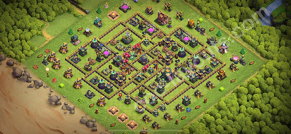 This Town Hall 14 farming base is optimized to protect your resources including Gold, Elixir, and Dark Elixir from raiders. The layout features centralized storages with multiple compartments that make it extremely difficult for attackers to steal large amounts of resources in a single raid. This design philosophy prioritizes resource protection over trophies, making it ideal for players focused on upgrading their village. The strategic placement of resource storages ensures they are well-protected by high-damage defenses like X-Bows, Inferno Towers, and Eagle Artillery. Each storage is surrounded by multiple wall layers and defensive structures, forcing attackers to invest heavily in troops and spells to reach your loot. The farming base design also incorporates strategic dead zones where attackers' troops tend to path inefficiently, wasting time and taking heavy damage from nearby defenses. Collectors and mines are positioned on the outer edges as "bait" while your main storages remain heavily protected in the core. This layout has proven effective against common farming strategies like BARCH (Barbarians + Archers), GoWiPe (Golems + Wizards + Pekka), and mass Miner attacks. The compartmentalized design prevents attackers from funneling straight to your resources, ensuring you maintain your hard-earned loot for important upgrades.