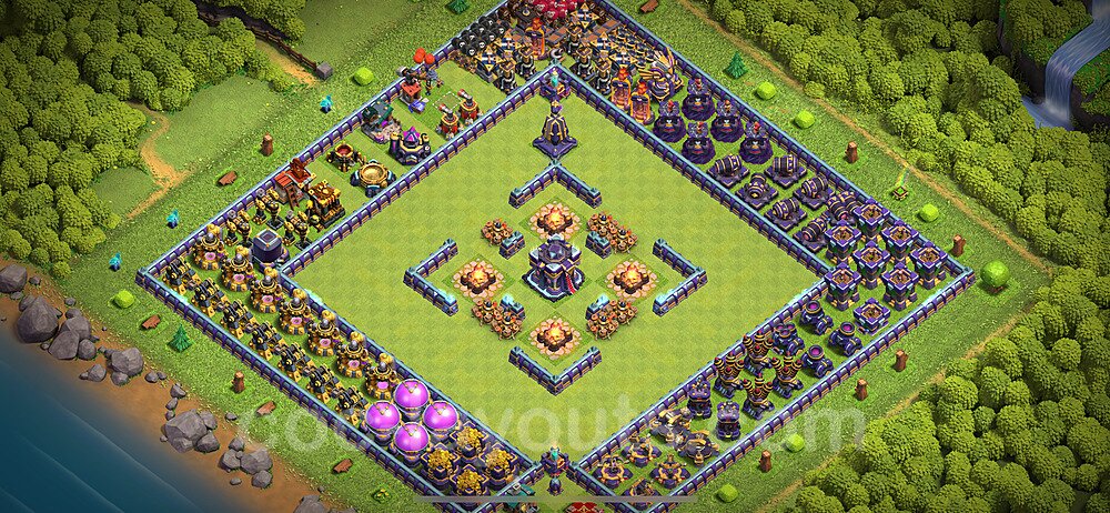 This Town Hall 15 war base is specifically designed to defend against 2-star and 3-star attacks in Clan Wars and Clan War Leagues. The strategic placement of defenses creates multiple compartments that force attackers to use more troops and spells than anticipated. Key defensive structures like Eagle Artillery, Inferno Towers, and X-Bows are positioned to cover crucial sections of the base, making it extremely difficult for opponents to secure a perfect attack. The core of this war base features a centralized Town Hall and Clan Castle, protected by multiple layers of walls and high-damage defenses. This layout forces attackers to commit significant resources just to reach the center, often leaving them without enough firepower to secure the Town Hall destruction. The anti-2-star design ensures that even if attackers breach the outer defenses, they'll struggle to achieve a 50% destruction rating. Air defenses are strategically spread to counter popular air attack strategies like LaLoon (Lava Hound + Balloons) and Electrone (Electro Dragons + Stone Slammer). The symmetrical trap placement and strategic Hidden Tesla positions create deadly surprise elements that can completely derail an attacker's plan. This base has been tested against various meta attack strategies and has consistently proven effective in preventing 3-star attacks.