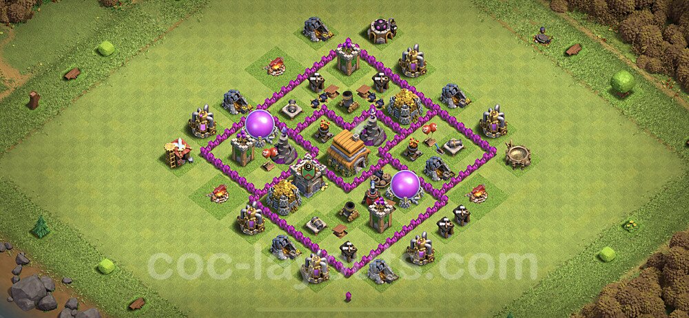 This Town Hall 6 hybrid base offers the best of both worlds - strong resource protection combined with effective trophy defense. The versatile design makes it an excellent choice for players who want to protect their loot while maintaining their trophy count. This balanced approach ensures you don't sacrifice one aspect of defense for another, making it ideal for active players across all league levels. The hybrid layout features centralized resource storages alongside a well-protected Town Hall, with multiple defensive layers that deter both farming raids and trophy pushers. High-value targets are strategically positioned within overlapping defense ranges, forcing attackers to make difficult choices about which objectives to prioritize. The compartmentalized design prevents attackers from easily achieving both loot destruction and the Town Hall kill in a single attack. Defense placement in this hybrid base creates strong coverage against both ground and air attacks. Inferno Towers, X-Bows, and Eagle Artillery work in concert to eliminate threats quickly, while splash damage defenses like Wizard Towers and Bomb Towers counter swarm strategies. The base's funnel-resistant design and strategic trap placement make it effective against popular attack strategies including QC LaLoon (Queen Charge Lava Hound Balloon), Blizzard attacks, and Yeti Smash compositions.