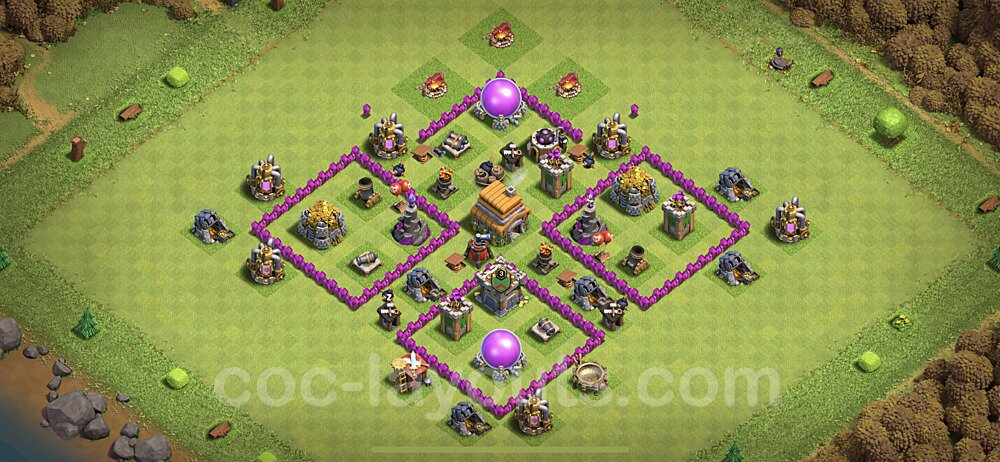 This Town Hall 6 hybrid base offers the best of both worlds - strong resource protection combined with effective trophy defense. The versatile design makes it an excellent choice for players who want to protect their loot while maintaining their trophy count. This balanced approach ensures you don't sacrifice one aspect of defense for another, making it ideal for active players across all league levels. The hybrid layout features centralized resource storages alongside a well-protected Town Hall, with multiple defensive layers that deter both farming raids and trophy pushers. High-value targets are strategically positioned within overlapping defense ranges, forcing attackers to make difficult choices about which objectives to prioritize. The compartmentalized design prevents attackers from easily achieving both loot destruction and the Town Hall kill in a single attack. Defense placement in this hybrid base creates strong coverage against both ground and air attacks. Inferno Towers, X-Bows, and Eagle Artillery work in concert to eliminate threats quickly, while splash damage defenses like Wizard Towers and Bomb Towers counter swarm strategies. The base's funnel-resistant design and strategic trap placement make it effective against popular attack strategies including QC LaLoon (Queen Charge Lava Hound Balloon), Blizzard attacks, and Yeti Smash compositions.