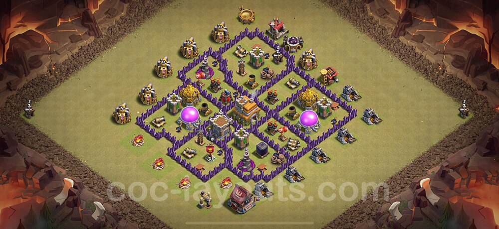 This Town Hall 7 hybrid base offers the best of both worlds - strong resource protection combined with effective trophy defense. The versatile design makes it an excellent choice for players who want to protect their loot while maintaining their trophy count. This balanced approach ensures you don't sacrifice one aspect of defense for another, making it ideal for active players across all league levels. The hybrid layout features centralized resource storages alongside a well-protected Town Hall, with multiple defensive layers that deter both farming raids and trophy pushers. High-value targets are strategically positioned within overlapping defense ranges, forcing attackers to make difficult choices about which objectives to prioritize. The compartmentalized design prevents attackers from easily achieving both loot destruction and the Town Hall kill in a single attack. Defense placement in this hybrid base creates strong coverage against both ground and air attacks. Inferno Towers, X-Bows, and Eagle Artillery work in concert to eliminate threats quickly, while splash damage defenses like Wizard Towers and Bomb Towers counter swarm strategies. The base's funnel-resistant design and strategic trap placement make it effective against popular attack strategies including QC LaLoon (Queen Charge Lava Hound Balloon), Blizzard attacks, and Yeti Smash compositions.