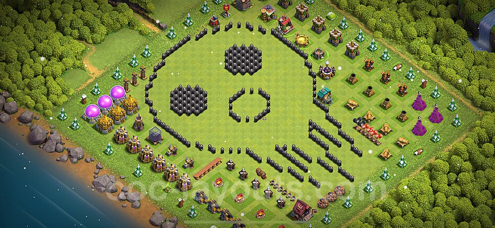 This Town Hall 8 war base is specifically designed to defend against 2-star and 3-star attacks in Clan Wars and Clan War Leagues. The strategic placement of defenses creates multiple compartments that force attackers to use more troops and spells than anticipated. Key defensive structures like Eagle Artillery, Inferno Towers, and X-Bows are positioned to cover crucial sections of the base, making it extremely difficult for opponents to secure a perfect attack. The core of this war base features a centralized Town Hall and Clan Castle, protected by multiple layers of walls and high-damage defenses. This layout forces attackers to commit significant resources just to reach the center, often leaving them without enough firepower to secure the Town Hall destruction. The anti-2-star design ensures that even if attackers breach the outer defenses, they'll struggle to achieve a 50% destruction rating. Air defenses are strategically spread to counter popular air attack strategies like LaLoon (Lava Hound + Balloons) and Electrone (Electro Dragons + Stone Slammer). The symmetrical trap placement and strategic Hidden Tesla positions create deadly surprise elements that can completely derail an attacker's plan. This base has been tested against various meta attack strategies and has consistently proven effective in preventing 3-star attacks.
