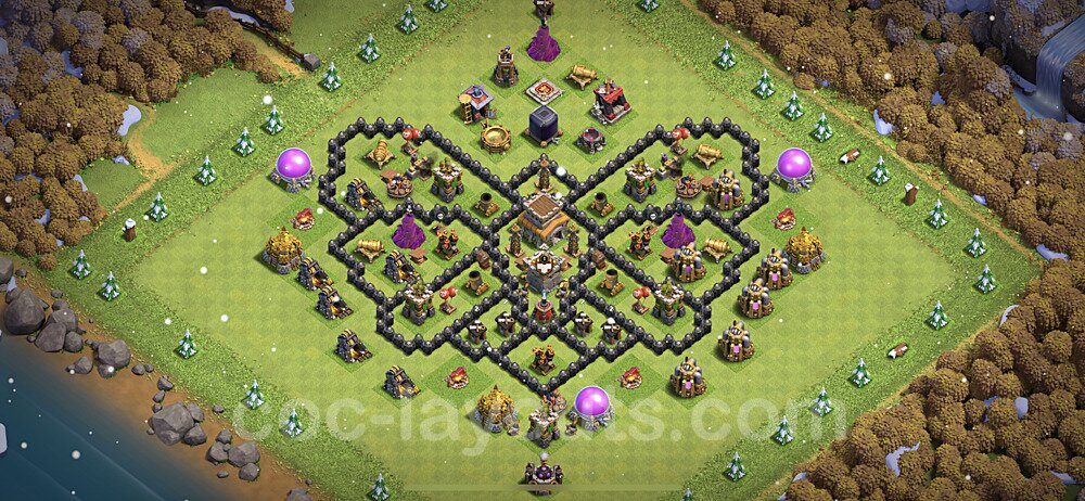 This Town Hall 8 war base is specifically designed to defend against 2-star and 3-star attacks in Clan Wars and Clan War Leagues. The strategic placement of defenses creates multiple compartments that force attackers to use more troops and spells than anticipated. Key defensive structures like Eagle Artillery, Inferno Towers, and X-Bows are positioned to cover crucial sections of the base, making it extremely difficult for opponents to secure a perfect attack. The core of this war base features a centralized Town Hall and Clan Castle, protected by multiple layers of walls and high-damage defenses. This layout forces attackers to commit significant resources just to reach the center, often leaving them without enough firepower to secure the Town Hall destruction. The anti-2-star design ensures that even if attackers breach the outer defenses, they'll struggle to achieve a 50% destruction rating. Air defenses are strategically spread to counter popular air attack strategies like LaLoon (Lava Hound + Balloons) and Electrone (Electro Dragons + Stone Slammer). The symmetrical trap placement and strategic Hidden Tesla positions create deadly surprise elements that can completely derail an attacker's plan. This base has been tested against various meta attack strategies and has consistently proven effective in preventing 3-star attacks.