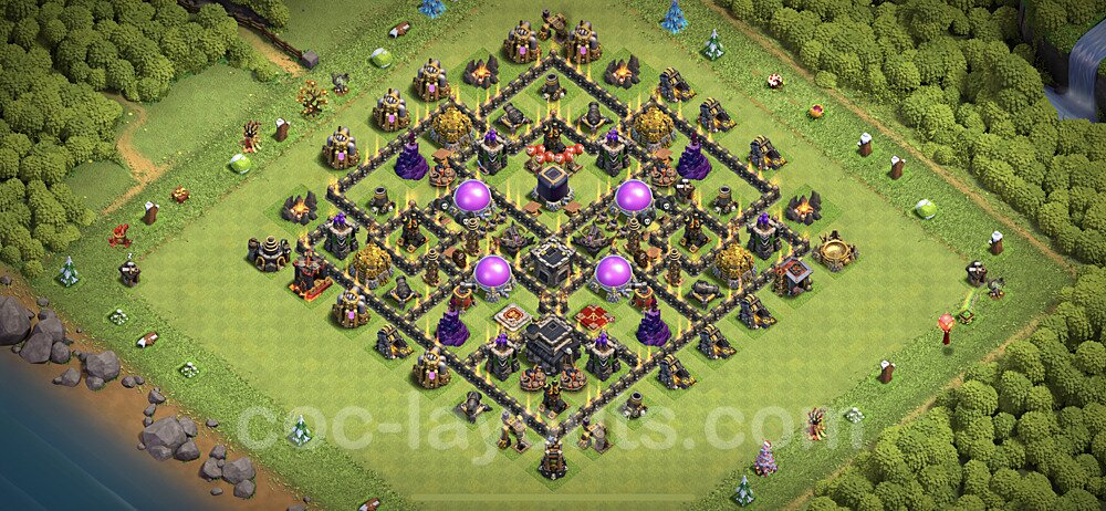 This Town Hall 9 hybrid base offers the best of both worlds - strong resource protection combined with effective trophy defense. The versatile design makes it an excellent choice for players who want to protect their loot while maintaining their trophy count. This balanced approach ensures you don't sacrifice one aspect of defense for another, making it ideal for active players across all league levels. The hybrid layout features centralized resource storages alongside a well-protected Town Hall, with multiple defensive layers that deter both farming raids and trophy pushers. High-value targets are strategically positioned within overlapping defense ranges, forcing attackers to make difficult choices about which objectives to prioritize. The compartmentalized design prevents attackers from easily achieving both loot destruction and the Town Hall kill in a single attack. Defense placement in this hybrid base creates strong coverage against both ground and air attacks. Inferno Towers, X-Bows, and Eagle Artillery work in concert to eliminate threats quickly, while splash damage defenses like Wizard Towers and Bomb Towers counter swarm strategies. The base's funnel-resistant design and strategic trap placement make it effective against popular attack strategies including QC LaLoon (Queen Charge Lava Hound Balloon), Blizzard attacks, and Yeti Smash compositions.