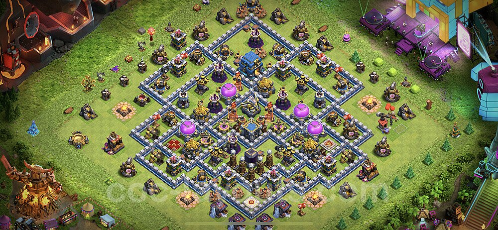 This Town Hall 12 hybrid base offers the best of both worlds - strong resource protection combined with effective trophy defense. The versatile design makes it an excellent choice for players who want to protect their loot while maintaining their trophy count. This balanced approach ensures you don't sacrifice one aspect of defense for another, making it ideal for active players across all league levels. The hybrid layout features centralized resource storages alongside a well-protected Town Hall, with multiple defensive layers that deter both farming raids and trophy pushers. High-value targets are strategically positioned within overlapping defense ranges, forcing attackers to make difficult choices about which objectives to prioritize. The compartmentalized design prevents attackers from easily achieving both loot destruction and the Town Hall kill in a single attack. Defense placement in this hybrid base creates strong coverage against both ground and air attacks. Inferno Towers, X-Bows, and Eagle Artillery work in concert to eliminate threats quickly, while splash damage defenses like Wizard Towers and Bomb Towers counter swarm strategies. The base's funnel-resistant design and strategic trap placement make it effective against popular attack strategies including QC LaLoon (Queen Charge Lava Hound Balloon), Blizzard attacks, and Yeti Smash compositions.