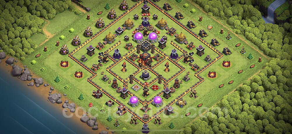 This Town Hall 10 hybrid base offers the best of both worlds - strong resource protection combined with effective trophy defense. The versatile design makes it an excellent choice for players who want to protect their loot while maintaining their trophy count. This balanced approach ensures you don't sacrifice one aspect of defense for another, making it ideal for active players across all league levels. The hybrid layout features centralized resource storages alongside a well-protected Town Hall, with multiple defensive layers that deter both farming raids and trophy pushers. High-value targets are strategically positioned within overlapping defense ranges, forcing attackers to make difficult choices about which objectives to prioritize. The compartmentalized design prevents attackers from easily achieving both loot destruction and the Town Hall kill in a single attack. Defense placement in this hybrid base creates strong coverage against both ground and air attacks. Inferno Towers, X-Bows, and Eagle Artillery work in concert to eliminate threats quickly, while splash damage defenses like Wizard Towers and Bomb Towers counter swarm strategies. The base's funnel-resistant design and strategic trap placement make it effective against popular attack strategies including QC LaLoon (Queen Charge Lava Hound Balloon), Blizzard attacks, and Yeti Smash compositions.