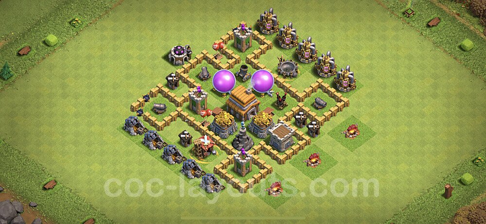 This Town Hall 5 hybrid base offers the best of both worlds - strong resource protection combined with effective trophy defense. The versatile design makes it an excellent choice for players who want to protect their loot while maintaining their trophy count. This balanced approach ensures you don't sacrifice one aspect of defense for another, making it ideal for active players across all league levels. The hybrid layout features centralized resource storages alongside a well-protected Town Hall, with multiple defensive layers that deter both farming raids and trophy pushers. High-value targets are strategically positioned within overlapping defense ranges, forcing attackers to make difficult choices about which objectives to prioritize. The compartmentalized design prevents attackers from easily achieving both loot destruction and the Town Hall kill in a single attack. Defense placement in this hybrid base creates strong coverage against both ground and air attacks. Inferno Towers, X-Bows, and Eagle Artillery work in concert to eliminate threats quickly, while splash damage defenses like Wizard Towers and Bomb Towers counter swarm strategies. The base's funnel-resistant design and strategic trap placement make it effective against popular attack strategies including QC LaLoon (Queen Charge Lava Hound Balloon), Blizzard attacks, and Yeti Smash compositions.