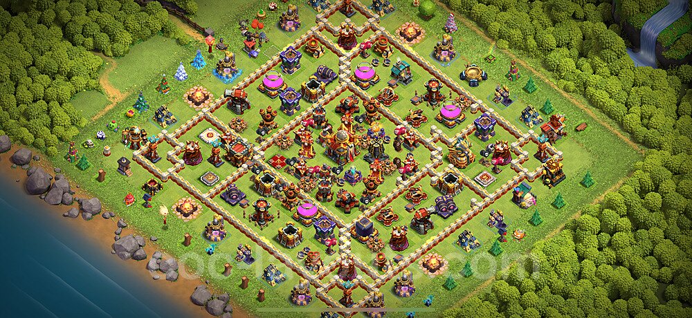 This Town Hall 16 hybrid base offers the best of both worlds - strong resource protection combined with effective trophy defense. The versatile design makes it an excellent choice for players who want to protect their loot while maintaining their trophy count. This balanced approach ensures you don't sacrifice one aspect of defense for another, making it ideal for active players across all league levels. The hybrid layout features centralized resource storages alongside a well-protected Town Hall, with multiple defensive layers that deter both farming raids and trophy pushers. High-value targets are strategically positioned within overlapping defense ranges, forcing attackers to make difficult choices about which objectives to prioritize. The compartmentalized design prevents attackers from easily achieving both loot destruction and the Town Hall kill in a single attack. Defense placement in this hybrid base creates strong coverage against both ground and air attacks. Inferno Towers, X-Bows, and Eagle Artillery work in concert to eliminate threats quickly, while splash damage defenses like Wizard Towers and Bomb Towers counter swarm strategies. The base's funnel-resistant design and strategic trap placement make it effective against popular attack strategies including QC LaLoon (Queen Charge Lava Hound Balloon), Blizzard attacks, and Yeti Smash compositions.