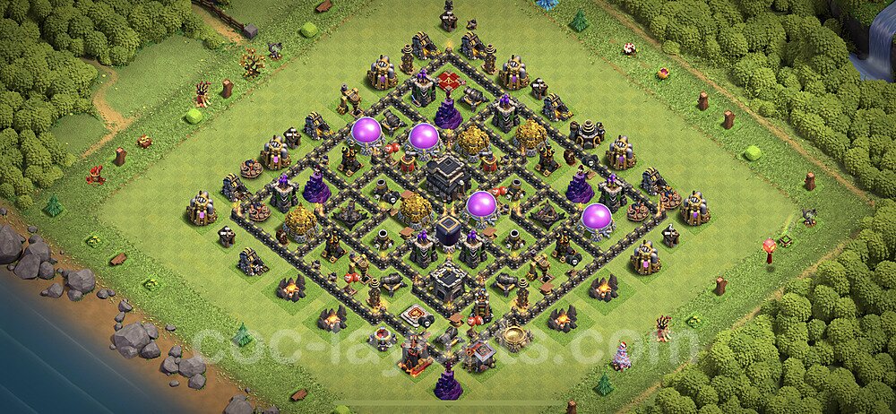 This Town Hall 9 hybrid base offers the best of both worlds - strong resource protection combined with effective trophy defense. The versatile design makes it an excellent choice for players who want to protect their loot while maintaining their trophy count. This balanced approach ensures you don't sacrifice one aspect of defense for another, making it ideal for active players across all league levels. The hybrid layout features centralized resource storages alongside a well-protected Town Hall, with multiple defensive layers that deter both farming raids and trophy pushers. High-value targets are strategically positioned within overlapping defense ranges, forcing attackers to make difficult choices about which objectives to prioritize. The compartmentalized design prevents attackers from easily achieving both loot destruction and the Town Hall kill in a single attack. Defense placement in this hybrid base creates strong coverage against both ground and air attacks. Inferno Towers, X-Bows, and Eagle Artillery work in concert to eliminate threats quickly, while splash damage defenses like Wizard Towers and Bomb Towers counter swarm strategies. The base's funnel-resistant design and strategic trap placement make it effective against popular attack strategies including QC LaLoon (Queen Charge Lava Hound Balloon), Blizzard attacks, and Yeti Smash compositions.
