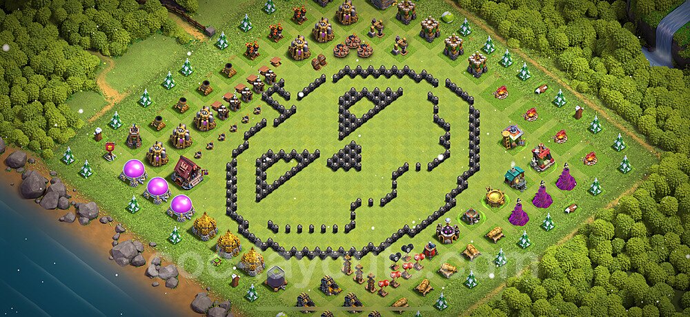 This Town Hall 8 war base is specifically designed to defend against 2-star and 3-star attacks in Clan Wars and Clan War Leagues. The strategic placement of defenses creates multiple compartments that force attackers to use more troops and spells than anticipated. Key defensive structures like Eagle Artillery, Inferno Towers, and X-Bows are positioned to cover crucial sections of the base, making it extremely difficult for opponents to secure a perfect attack. The core of this war base features a centralized Town Hall and Clan Castle, protected by multiple layers of walls and high-damage defenses. This layout forces attackers to commit significant resources just to reach the center, often leaving them without enough firepower to secure the Town Hall destruction. The anti-2-star design ensures that even if attackers breach the outer defenses, they'll struggle to achieve a 50% destruction rating. Air defenses are strategically spread to counter popular air attack strategies like LaLoon (Lava Hound + Balloons) and Electrone (Electro Dragons + Stone Slammer). The symmetrical trap placement and strategic Hidden Tesla positions create deadly surprise elements that can completely derail an attacker's plan. This base has been tested against various meta attack strategies and has consistently proven effective in preventing 3-star attacks.