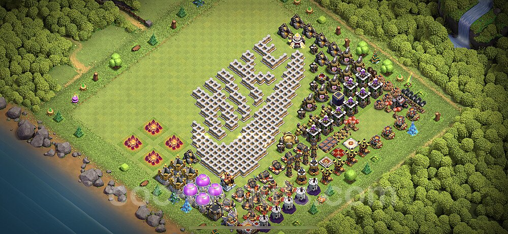 This Town Hall 11 war base is specifically designed to defend against 2-star and 3-star attacks in Clan Wars and Clan War Leagues. The strategic placement of defenses creates multiple compartments that force attackers to use more troops and spells than anticipated. Key defensive structures like Eagle Artillery, Inferno Towers, and X-Bows are positioned to cover crucial sections of the base, making it extremely difficult for opponents to secure a perfect attack. The core of this war base features a centralized Town Hall and Clan Castle, protected by multiple layers of walls and high-damage defenses. This layout forces attackers to commit significant resources just to reach the center, often leaving them without enough firepower to secure the Town Hall destruction. The anti-2-star design ensures that even if attackers breach the outer defenses, they'll struggle to achieve a 50% destruction rating. Air defenses are strategically spread to counter popular air attack strategies like LaLoon (Lava Hound + Balloons) and Electrone (Electro Dragons + Stone Slammer). The symmetrical trap placement and strategic Hidden Tesla positions create deadly surprise elements that can completely derail an attacker's plan. This base has been tested against various meta attack strategies and has consistently proven effective in preventing 3-star attacks.