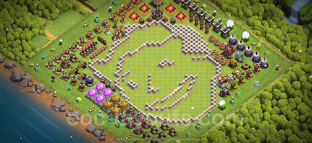This Town Hall 11 war base is specifically designed to defend against 2-star and 3-star attacks in Clan Wars and Clan War Leagues. The strategic placement of defenses creates multiple compartments that force attackers to use more troops and spells than anticipated. Key defensive structures like Eagle Artillery, Inferno Towers, and X-Bows are positioned to cover crucial sections of the base, making it extremely difficult for opponents to secure a perfect attack. The core of this war base features a centralized Town Hall and Clan Castle, protected by multiple layers of walls and high-damage defenses. This layout forces attackers to commit significant resources just to reach the center, often leaving them without enough firepower to secure the Town Hall destruction. The anti-2-star design ensures that even if attackers breach the outer defenses, they'll struggle to achieve a 50% destruction rating. Air defenses are strategically spread to counter popular air attack strategies like LaLoon (Lava Hound + Balloons) and Electrone (Electro Dragons + Stone Slammer). The symmetrical trap placement and strategic Hidden Tesla positions create deadly surprise elements that can completely derail an attacker's plan. This base has been tested against various meta attack strategies and has consistently proven effective in preventing 3-star attacks.