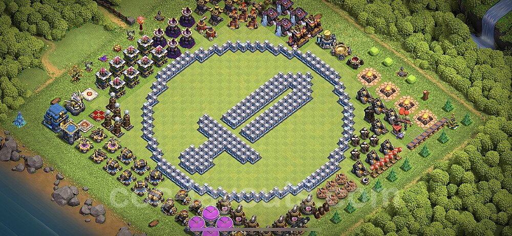 This Town Hall 12 war base is specifically designed to defend against 2-star and 3-star attacks in Clan Wars and Clan War Leagues. The strategic placement of defenses creates multiple compartments that force attackers to use more troops and spells than anticipated. Key defensive structures like Eagle Artillery, Inferno Towers, and X-Bows are positioned to cover crucial sections of the base, making it extremely difficult for opponents to secure a perfect attack. The core of this war base features a centralized Town Hall and Clan Castle, protected by multiple layers of walls and high-damage defenses. This layout forces attackers to commit significant resources just to reach the center, often leaving them without enough firepower to secure the Town Hall destruction. The anti-2-star design ensures that even if attackers breach the outer defenses, they'll struggle to achieve a 50% destruction rating. Air defenses are strategically spread to counter popular air attack strategies like LaLoon (Lava Hound + Balloons) and Electrone (Electro Dragons + Stone Slammer). The symmetrical trap placement and strategic Hidden Tesla positions create deadly surprise elements that can completely derail an attacker's plan. This base has been tested against various meta attack strategies and has consistently proven effective in preventing 3-star attacks.