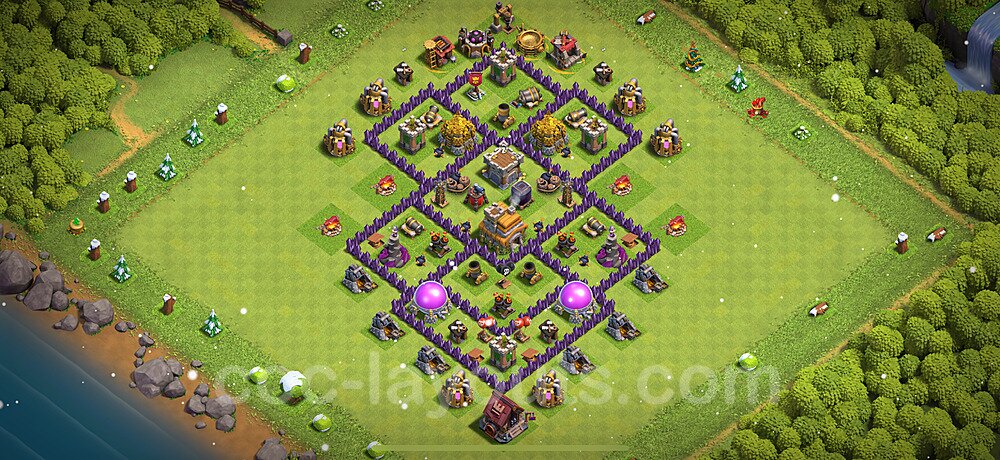 This Town Hall 7 war base is specifically designed to defend against 2-star and 3-star attacks in Clan Wars and Clan War Leagues. The strategic placement of defenses creates multiple compartments that force attackers to use more troops and spells than anticipated. Key defensive structures like Eagle Artillery, Inferno Towers, and X-Bows are positioned to cover crucial sections of the base, making it extremely difficult for opponents to secure a perfect attack. The core of this war base features a centralized Town Hall and Clan Castle, protected by multiple layers of walls and high-damage defenses. This layout forces attackers to commit significant resources just to reach the center, often leaving them without enough firepower to secure the Town Hall destruction. The anti-2-star design ensures that even if attackers breach the outer defenses, they'll struggle to achieve a 50% destruction rating. Air defenses are strategically spread to counter popular air attack strategies like LaLoon (Lava Hound + Balloons) and Electrone (Electro Dragons + Stone Slammer). The symmetrical trap placement and strategic Hidden Tesla positions create deadly surprise elements that can completely derail an attacker's plan. This base has been tested against various meta attack strategies and has consistently proven effective in preventing 3-star attacks.