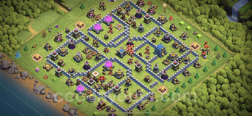 This Town Hall 12 war base is specifically designed to defend against 2-star and 3-star attacks in Clan Wars and Clan War Leagues. The strategic placement of defenses creates multiple compartments that force attackers to use more troops and spells than anticipated. Key defensive structures like Eagle Artillery, Inferno Towers, and X-Bows are positioned to cover crucial sections of the base, making it extremely difficult for opponents to secure a perfect attack. The core of this war base features a centralized Town Hall and Clan Castle, protected by multiple layers of walls and high-damage defenses. This layout forces attackers to commit significant resources just to reach the center, often leaving them without enough firepower to secure the Town Hall destruction. The anti-2-star design ensures that even if attackers breach the outer defenses, they'll struggle to achieve a 50% destruction rating. Air defenses are strategically spread to counter popular air attack strategies like LaLoon (Lava Hound + Balloons) and Electrone (Electro Dragons + Stone Slammer). The symmetrical trap placement and strategic Hidden Tesla positions create deadly surprise elements that can completely derail an attacker's plan. This base has been tested against various meta attack strategies and has consistently proven effective in preventing 3-star attacks.