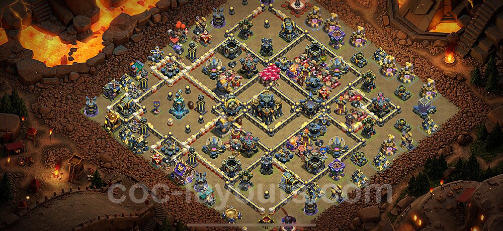 This Town Hall 17 war base is specifically designed to defend against 2-star and 3-star attacks in Clan Wars and Clan War Leagues. The strategic placement of defenses creates multiple compartments that force attackers to use more troops and spells than anticipated. Key defensive structures like Eagle Artillery, Inferno Towers, and X-Bows are positioned to cover crucial sections of the base, making it extremely difficult for opponents to secure a perfect attack. The core of this war base features a centralized Town Hall and Clan Castle, protected by multiple layers of walls and high-damage defenses. This layout forces attackers to commit significant resources just to reach the center, often leaving them without enough firepower to secure the Town Hall destruction. The anti-2-star design ensures that even if attackers breach the outer defenses, they'll struggle to achieve a 50% destruction rating. Air defenses are strategically spread to counter popular air attack strategies like LaLoon (Lava Hound + Balloons) and Electrone (Electro Dragons + Stone Slammer). The symmetrical trap placement and strategic Hidden Tesla positions create deadly surprise elements that can completely derail an attacker's plan. This base has been tested against various meta attack strategies and has consistently proven effective in preventing 3-star attacks.