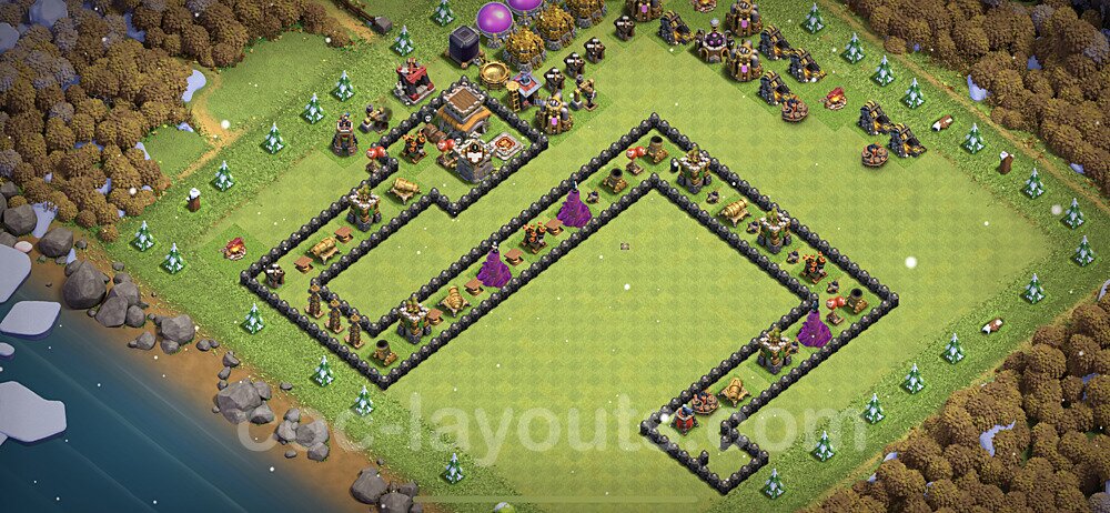 This Town Hall 8 war base is specifically designed to defend against 2-star and 3-star attacks in Clan Wars and Clan War Leagues. The strategic placement of defenses creates multiple compartments that force attackers to use more troops and spells than anticipated. Key defensive structures like Eagle Artillery, Inferno Towers, and X-Bows are positioned to cover crucial sections of the base, making it extremely difficult for opponents to secure a perfect attack. The core of this war base features a centralized Town Hall and Clan Castle, protected by multiple layers of walls and high-damage defenses. This layout forces attackers to commit significant resources just to reach the center, often leaving them without enough firepower to secure the Town Hall destruction. The anti-2-star design ensures that even if attackers breach the outer defenses, they'll struggle to achieve a 50% destruction rating. Air defenses are strategically spread to counter popular air attack strategies like LaLoon (Lava Hound + Balloons) and Electrone (Electro Dragons + Stone Slammer). The symmetrical trap placement and strategic Hidden Tesla positions create deadly surprise elements that can completely derail an attacker's plan. This base has been tested against various meta attack strategies and has consistently proven effective in preventing 3-star attacks.