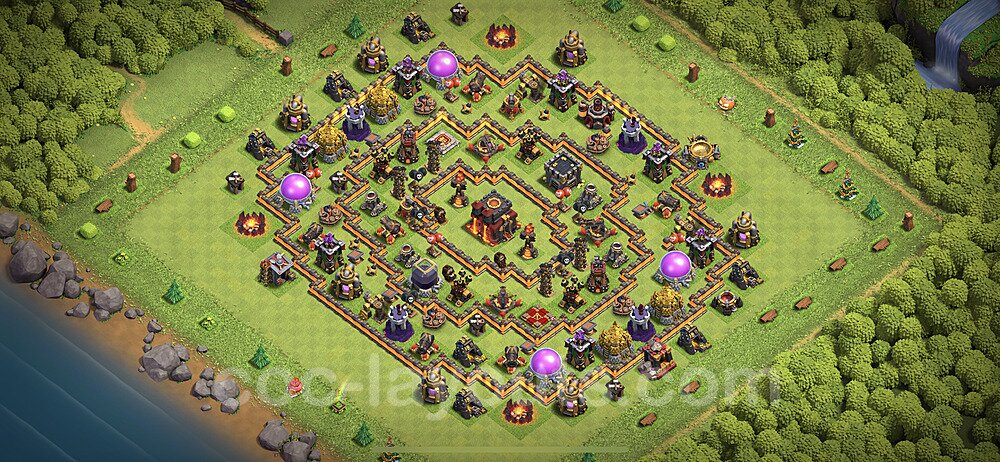 This Town Hall 10 hybrid base offers the best of both worlds - strong resource protection combined with effective trophy defense. The versatile design makes it an excellent choice for players who want to protect their loot while maintaining their trophy count. This balanced approach ensures you don't sacrifice one aspect of defense for another, making it ideal for active players across all league levels. The hybrid layout features centralized resource storages alongside a well-protected Town Hall, with multiple defensive layers that deter both farming raids and trophy pushers. High-value targets are strategically positioned within overlapping defense ranges, forcing attackers to make difficult choices about which objectives to prioritize. The compartmentalized design prevents attackers from easily achieving both loot destruction and the Town Hall kill in a single attack. Defense placement in this hybrid base creates strong coverage against both ground and air attacks. Inferno Towers, X-Bows, and Eagle Artillery work in concert to eliminate threats quickly, while splash damage defenses like Wizard Towers and Bomb Towers counter swarm strategies. The base's funnel-resistant design and strategic trap placement make it effective against popular attack strategies including QC LaLoon (Queen Charge Lava Hound Balloon), Blizzard attacks, and Yeti Smash compositions.