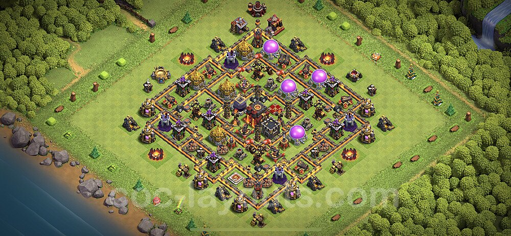 This Town Hall 10 hybrid base offers the best of both worlds - strong resource protection combined with effective trophy defense. The versatile design makes it an excellent choice for players who want to protect their loot while maintaining their trophy count. This balanced approach ensures you don't sacrifice one aspect of defense for another, making it ideal for active players across all league levels. The hybrid layout features centralized resource storages alongside a well-protected Town Hall, with multiple defensive layers that deter both farming raids and trophy pushers. High-value targets are strategically positioned within overlapping defense ranges, forcing attackers to make difficult choices about which objectives to prioritize. The compartmentalized design prevents attackers from easily achieving both loot destruction and the Town Hall kill in a single attack. Defense placement in this hybrid base creates strong coverage against both ground and air attacks. Inferno Towers, X-Bows, and Eagle Artillery work in concert to eliminate threats quickly, while splash damage defenses like Wizard Towers and Bomb Towers counter swarm strategies. The base's funnel-resistant design and strategic trap placement make it effective against popular attack strategies including QC LaLoon (Queen Charge Lava Hound Balloon), Blizzard attacks, and Yeti Smash compositions.