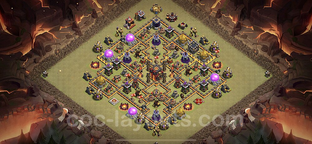 This Town Hall 10 war base is specifically designed to defend against 2-star and 3-star attacks in Clan Wars and Clan War Leagues. The strategic placement of defenses creates multiple compartments that force attackers to use more troops and spells than anticipated. Key defensive structures like Eagle Artillery, Inferno Towers, and X-Bows are positioned to cover crucial sections of the base, making it extremely difficult for opponents to secure a perfect attack. The core of this war base features a centralized Town Hall and Clan Castle, protected by multiple layers of walls and high-damage defenses. This layout forces attackers to commit significant resources just to reach the center, often leaving them without enough firepower to secure the Town Hall destruction. The anti-2-star design ensures that even if attackers breach the outer defenses, they'll struggle to achieve a 50% destruction rating. Air defenses are strategically spread to counter popular air attack strategies like LaLoon (Lava Hound + Balloons) and Electrone (Electro Dragons + Stone Slammer). The symmetrical trap placement and strategic Hidden Tesla positions create deadly surprise elements that can completely derail an attacker's plan. This base has been tested against various meta attack strategies and has consistently proven effective in preventing 3-star attacks.