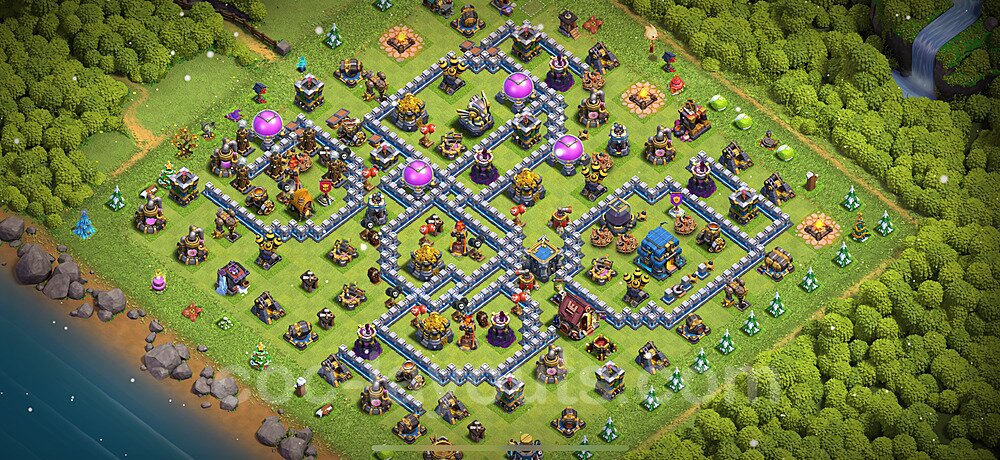 This Town Hall 12 farming base is optimized to protect your resources including Gold, Elixir, and Dark Elixir from raiders. The layout features centralized storages with multiple compartments that make it extremely difficult for attackers to steal large amounts of resources in a single raid. This design philosophy prioritizes resource protection over trophies, making it ideal for players focused on upgrading their village. The strategic placement of resource storages ensures they are well-protected by high-damage defenses like X-Bows, Inferno Towers, and Eagle Artillery. Each storage is surrounded by multiple wall layers and defensive structures, forcing attackers to invest heavily in troops and spells to reach your loot. The farming base design also incorporates strategic dead zones where attackers' troops tend to path inefficiently, wasting time and taking heavy damage from nearby defenses. Collectors and mines are positioned on the outer edges as "bait" while your main storages remain heavily protected in the core. This layout has proven effective against common farming strategies like BARCH (Barbarians + Archers), GoWiPe (Golems + Wizards + Pekka), and mass Miner attacks. The compartmentalized design prevents attackers from funneling straight to your resources, ensuring you maintain your hard-earned loot for important upgrades.