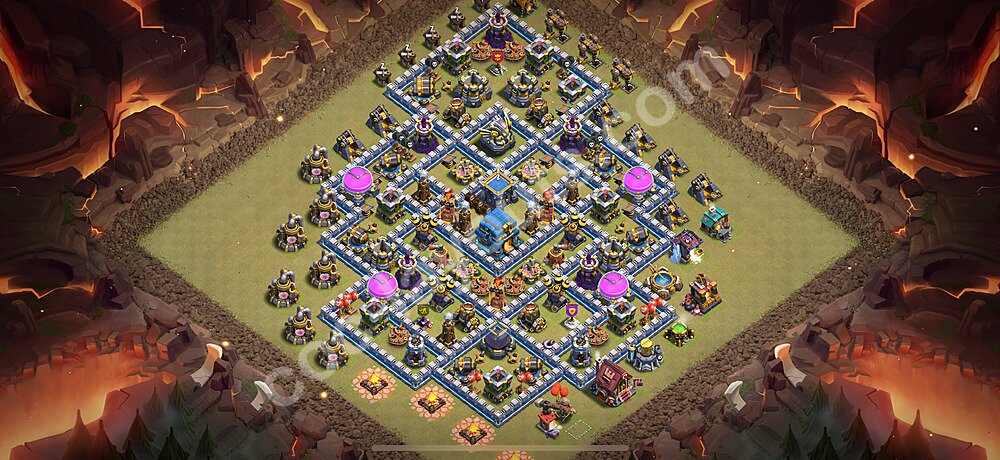 This Town Hall 12 war base is specifically designed to defend against 2-star and 3-star attacks in Clan Wars and Clan War Leagues. The strategic placement of defenses creates multiple compartments that force attackers to use more troops and spells than anticipated. Key defensive structures like Eagle Artillery, Inferno Towers, and X-Bows are positioned to cover crucial sections of the base, making it extremely difficult for opponents to secure a perfect attack. The core of this war base features a centralized Town Hall and Clan Castle, protected by multiple layers of walls and high-damage defenses. This layout forces attackers to commit significant resources just to reach the center, often leaving them without enough firepower to secure the Town Hall destruction. The anti-2-star design ensures that even if attackers breach the outer defenses, they'll struggle to achieve a 50% destruction rating. Air defenses are strategically spread to counter popular air attack strategies like LaLoon (Lava Hound + Balloons) and Electrone (Electro Dragons + Stone Slammer). The symmetrical trap placement and strategic Hidden Tesla positions create deadly surprise elements that can completely derail an attacker's plan. This base has been tested against various meta attack strategies and has consistently proven effective in preventing 3-star attacks.