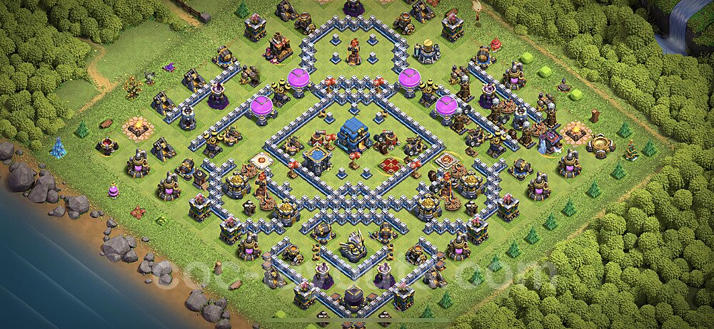 This Town Hall 12 war base is specifically designed to defend against 2-star and 3-star attacks in Clan Wars and Clan War Leagues. The strategic placement of defenses creates multiple compartments that force attackers to use more troops and spells than anticipated. Key defensive structures like Eagle Artillery, Inferno Towers, and X-Bows are positioned to cover crucial sections of the base, making it extremely difficult for opponents to secure a perfect attack. The core of this war base features a centralized Town Hall and Clan Castle, protected by multiple layers of walls and high-damage defenses. This layout forces attackers to commit significant resources just to reach the center, often leaving them without enough firepower to secure the Town Hall destruction. The anti-2-star design ensures that even if attackers breach the outer defenses, they'll struggle to achieve a 50% destruction rating. Air defenses are strategically spread to counter popular air attack strategies like LaLoon (Lava Hound + Balloons) and Electrone (Electro Dragons + Stone Slammer). The symmetrical trap placement and strategic Hidden Tesla positions create deadly surprise elements that can completely derail an attacker's plan. This base has been tested against various meta attack strategies and has consistently proven effective in preventing 3-star attacks.