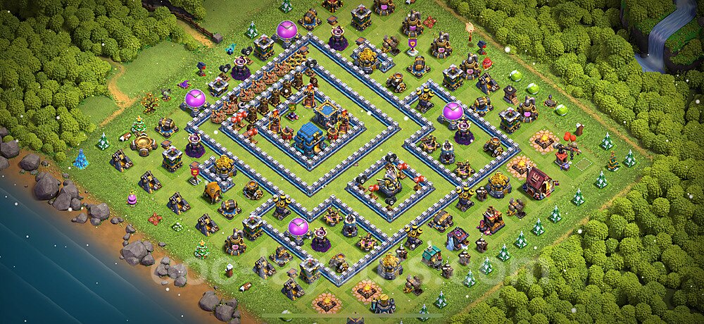 This Town Hall 12 war base is specifically designed to defend against 2-star and 3-star attacks in Clan Wars and Clan War Leagues. The strategic placement of defenses creates multiple compartments that force attackers to use more troops and spells than anticipated. Key defensive structures like Eagle Artillery, Inferno Towers, and X-Bows are positioned to cover crucial sections of the base, making it extremely difficult for opponents to secure a perfect attack. The core of this war base features a centralized Town Hall and Clan Castle, protected by multiple layers of walls and high-damage defenses. This layout forces attackers to commit significant resources just to reach the center, often leaving them without enough firepower to secure the Town Hall destruction. The anti-2-star design ensures that even if attackers breach the outer defenses, they'll struggle to achieve a 50% destruction rating. Air defenses are strategically spread to counter popular air attack strategies like LaLoon (Lava Hound + Balloons) and Electrone (Electro Dragons + Stone Slammer). The symmetrical trap placement and strategic Hidden Tesla positions create deadly surprise elements that can completely derail an attacker's plan. This base has been tested against various meta attack strategies and has consistently proven effective in preventing 3-star attacks.