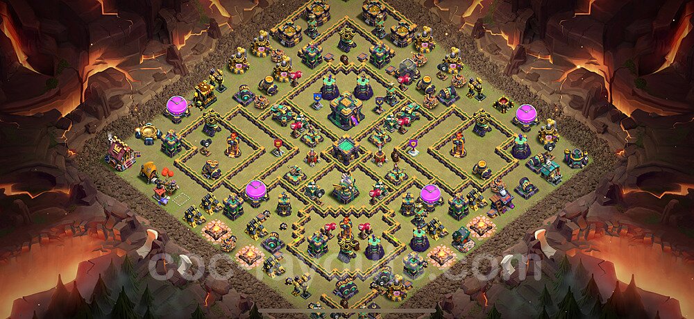 This Town Hall 14 war base is specifically designed to defend against 2-star and 3-star attacks in Clan Wars and Clan War Leagues. The strategic placement of defenses creates multiple compartments that force attackers to use more troops and spells than anticipated. Key defensive structures like Eagle Artillery, Inferno Towers, and X-Bows are positioned to cover crucial sections of the base, making it extremely difficult for opponents to secure a perfect attack. The core of this war base features a centralized Town Hall and Clan Castle, protected by multiple layers of walls and high-damage defenses. This layout forces attackers to commit significant resources just to reach the center, often leaving them without enough firepower to secure the Town Hall destruction. The anti-2-star design ensures that even if attackers breach the outer defenses, they'll struggle to achieve a 50% destruction rating. Air defenses are strategically spread to counter popular air attack strategies like LaLoon (Lava Hound + Balloons) and Electrone (Electro Dragons + Stone Slammer). The symmetrical trap placement and strategic Hidden Tesla positions create deadly surprise elements that can completely derail an attacker's plan. This base has been tested against various meta attack strategies and has consistently proven effective in preventing 3-star attacks.