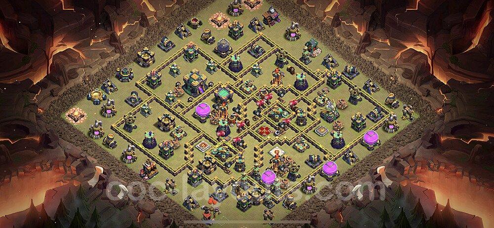This Town Hall 14 war base is specifically designed to defend against 2-star and 3-star attacks in Clan Wars and Clan War Leagues. The strategic placement of defenses creates multiple compartments that force attackers to use more troops and spells than anticipated. Key defensive structures like Eagle Artillery, Inferno Towers, and X-Bows are positioned to cover crucial sections of the base, making it extremely difficult for opponents to secure a perfect attack. The core of this war base features a centralized Town Hall and Clan Castle, protected by multiple layers of walls and high-damage defenses. This layout forces attackers to commit significant resources just to reach the center, often leaving them without enough firepower to secure the Town Hall destruction. The anti-2-star design ensures that even if attackers breach the outer defenses, they'll struggle to achieve a 50% destruction rating. Air defenses are strategically spread to counter popular air attack strategies like LaLoon (Lava Hound + Balloons) and Electrone (Electro Dragons + Stone Slammer). The symmetrical trap placement and strategic Hidden Tesla positions create deadly surprise elements that can completely derail an attacker's plan. This base has been tested against various meta attack strategies and has consistently proven effective in preventing 3-star attacks.