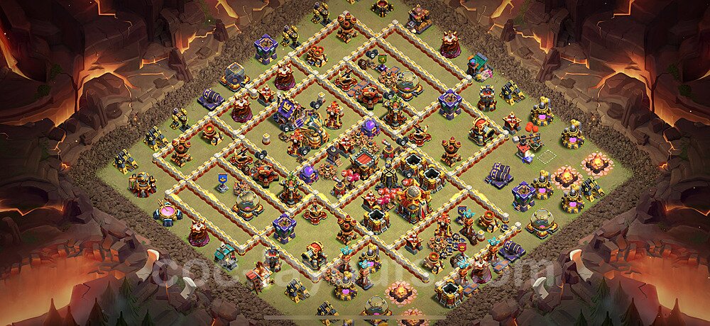 This Town Hall 16 war base is specifically designed to defend against 2-star and 3-star attacks in Clan Wars and Clan War Leagues. The strategic placement of defenses creates multiple compartments that force attackers to use more troops and spells than anticipated. Key defensive structures like Eagle Artillery, Inferno Towers, and X-Bows are positioned to cover crucial sections of the base, making it extremely difficult for opponents to secure a perfect attack. The core of this war base features a centralized Town Hall and Clan Castle, protected by multiple layers of walls and high-damage defenses. This layout forces attackers to commit significant resources just to reach the center, often leaving them without enough firepower to secure the Town Hall destruction. The anti-2-star design ensures that even if attackers breach the outer defenses, they'll struggle to achieve a 50% destruction rating. Air defenses are strategically spread to counter popular air attack strategies like LaLoon (Lava Hound + Balloons) and Electrone (Electro Dragons + Stone Slammer). The symmetrical trap placement and strategic Hidden Tesla positions create deadly surprise elements that can completely derail an attacker's plan. This base has been tested against various meta attack strategies and has consistently proven effective in preventing 3-star attacks.