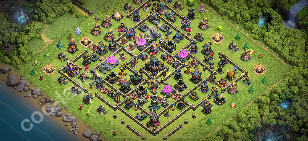 This Town Hall 17 hybrid base offers the best of both worlds - strong resource protection combined with effective trophy defense. The versatile design makes it an excellent choice for players who want to protect their loot while maintaining their trophy count. This balanced approach ensures you don't sacrifice one aspect of defense for another, making it ideal for active players across all league levels. The hybrid layout features centralized resource storages alongside a well-protected Town Hall, with multiple defensive layers that deter both farming raids and trophy pushers. High-value targets are strategically positioned within overlapping defense ranges, forcing attackers to make difficult choices about which objectives to prioritize. The compartmentalized design prevents attackers from easily achieving both loot destruction and the Town Hall kill in a single attack. Defense placement in this hybrid base creates strong coverage against both ground and air attacks. Inferno Towers, X-Bows, and Eagle Artillery work in concert to eliminate threats quickly, while splash damage defenses like Wizard Towers and Bomb Towers counter swarm strategies. The base's funnel-resistant design and strategic trap placement make it effective against popular attack strategies including QC LaLoon (Queen Charge Lava Hound Balloon), Blizzard attacks, and Yeti Smash compositions.