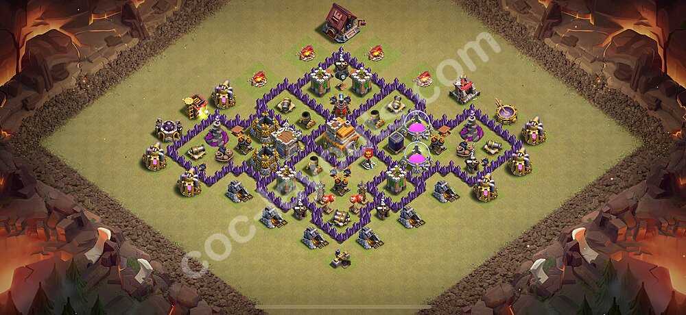 This Town Hall 7 hybrid base offers the best of both worlds - strong resource protection combined with effective trophy defense. The versatile design makes it an excellent choice for players who want to protect their loot while maintaining their trophy count. This balanced approach ensures you don't sacrifice one aspect of defense for another, making it ideal for active players across all league levels. The hybrid layout features centralized resource storages alongside a well-protected Town Hall, with multiple defensive layers that deter both farming raids and trophy pushers. High-value targets are strategically positioned within overlapping defense ranges, forcing attackers to make difficult choices about which objectives to prioritize. The compartmentalized design prevents attackers from easily achieving both loot destruction and the Town Hall kill in a single attack. Defense placement in this hybrid base creates strong coverage against both ground and air attacks. Inferno Towers, X-Bows, and Eagle Artillery work in concert to eliminate threats quickly, while splash damage defenses like Wizard Towers and Bomb Towers counter swarm strategies. The base's funnel-resistant design and strategic trap placement make it effective against popular attack strategies including QC LaLoon (Queen Charge Lava Hound Balloon), Blizzard attacks, and Yeti Smash compositions.
