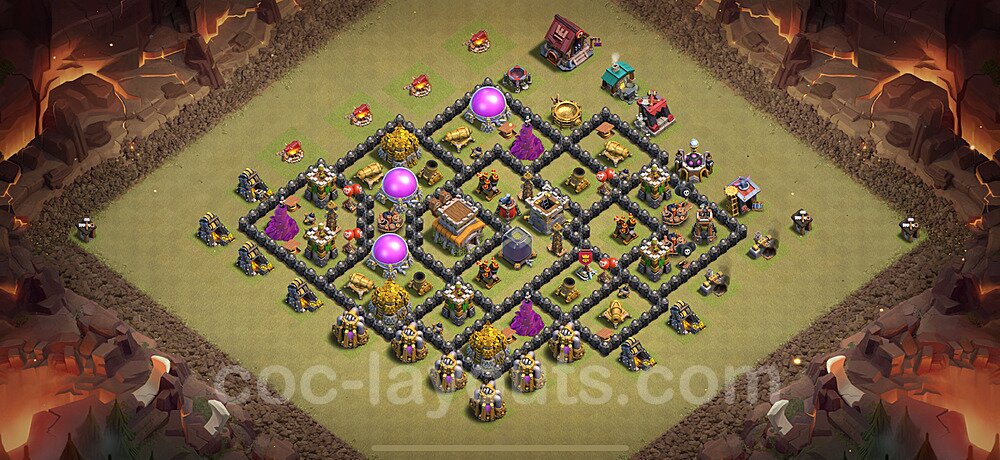 This Town Hall 8 hybrid base offers the best of both worlds - strong resource protection combined with effective trophy defense. The versatile design makes it an excellent choice for players who want to protect their loot while maintaining their trophy count. This balanced approach ensures you don't sacrifice one aspect of defense for another, making it ideal for active players across all league levels. The hybrid layout features centralized resource storages alongside a well-protected Town Hall, with multiple defensive layers that deter both farming raids and trophy pushers. High-value targets are strategically positioned within overlapping defense ranges, forcing attackers to make difficult choices about which objectives to prioritize. The compartmentalized design prevents attackers from easily achieving both loot destruction and the Town Hall kill in a single attack. Defense placement in this hybrid base creates strong coverage against both ground and air attacks. Inferno Towers, X-Bows, and Eagle Artillery work in concert to eliminate threats quickly, while splash damage defenses like Wizard Towers and Bomb Towers counter swarm strategies. The base's funnel-resistant design and strategic trap placement make it effective against popular attack strategies including QC LaLoon (Queen Charge Lava Hound Balloon), Blizzard attacks, and Yeti Smash compositions.