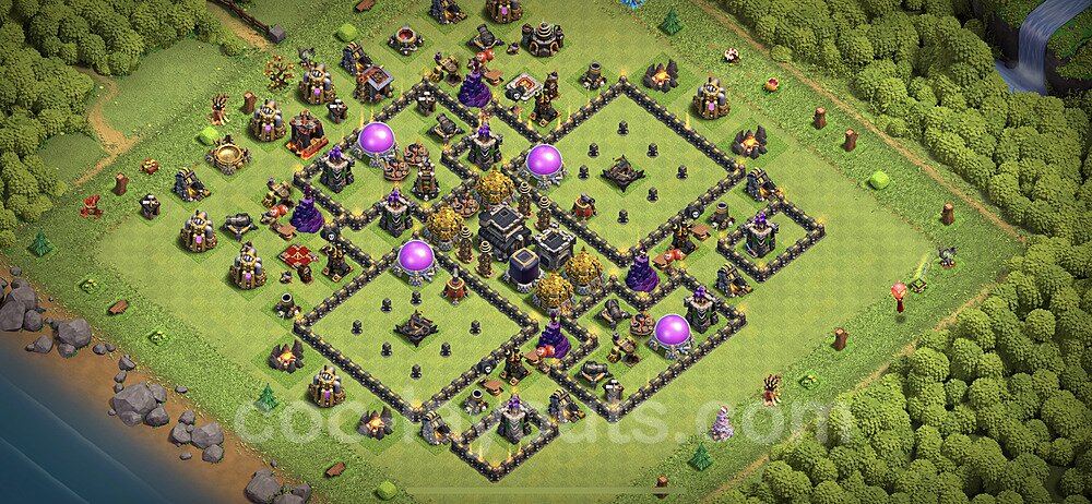 This Town Hall 9 farming base is optimized to protect your resources including Gold, Elixir, and Dark Elixir from raiders. The layout features centralized storages with multiple compartments that make it extremely difficult for attackers to steal large amounts of resources in a single raid. This design philosophy prioritizes resource protection over trophies, making it ideal for players focused on upgrading their village. The strategic placement of resource storages ensures they are well-protected by high-damage defenses like X-Bows, Inferno Towers, and Eagle Artillery. Each storage is surrounded by multiple wall layers and defensive structures, forcing attackers to invest heavily in troops and spells to reach your loot. The farming base design also incorporates strategic dead zones where attackers' troops tend to path inefficiently, wasting time and taking heavy damage from nearby defenses. Collectors and mines are positioned on the outer edges as "bait" while your main storages remain heavily protected in the core. This layout has proven effective against common farming strategies like BARCH (Barbarians + Archers), GoWiPe (Golems + Wizards + Pekka), and mass Miner attacks. The compartmentalized design prevents attackers from funneling straight to your resources, ensuring you maintain your hard-earned loot for important upgrades.