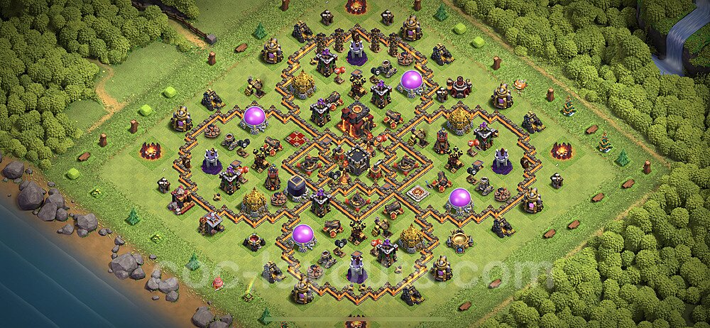 This Town Hall 10 hybrid base offers the best of both worlds - strong resource protection combined with effective trophy defense. The versatile design makes it an excellent choice for players who want to protect their loot while maintaining their trophy count. This balanced approach ensures you don't sacrifice one aspect of defense for another, making it ideal for active players across all league levels. The hybrid layout features centralized resource storages alongside a well-protected Town Hall, with multiple defensive layers that deter both farming raids and trophy pushers. High-value targets are strategically positioned within overlapping defense ranges, forcing attackers to make difficult choices about which objectives to prioritize. The compartmentalized design prevents attackers from easily achieving both loot destruction and the Town Hall kill in a single attack. Defense placement in this hybrid base creates strong coverage against both ground and air attacks. Inferno Towers, X-Bows, and Eagle Artillery work in concert to eliminate threats quickly, while splash damage defenses like Wizard Towers and Bomb Towers counter swarm strategies. The base's funnel-resistant design and strategic trap placement make it effective against popular attack strategies including QC LaLoon (Queen Charge Lava Hound Balloon), Blizzard attacks, and Yeti Smash compositions.