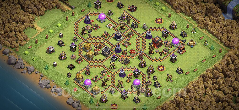 This Town Hall 10 hybrid base offers the best of both worlds - strong resource protection combined with effective trophy defense. The versatile design makes it an excellent choice for players who want to protect their loot while maintaining their trophy count. This balanced approach ensures you don't sacrifice one aspect of defense for another, making it ideal for active players across all league levels. The hybrid layout features centralized resource storages alongside a well-protected Town Hall, with multiple defensive layers that deter both farming raids and trophy pushers. High-value targets are strategically positioned within overlapping defense ranges, forcing attackers to make difficult choices about which objectives to prioritize. The compartmentalized design prevents attackers from easily achieving both loot destruction and the Town Hall kill in a single attack. Defense placement in this hybrid base creates strong coverage against both ground and air attacks. Inferno Towers, X-Bows, and Eagle Artillery work in concert to eliminate threats quickly, while splash damage defenses like Wizard Towers and Bomb Towers counter swarm strategies. The base's funnel-resistant design and strategic trap placement make it effective against popular attack strategies including QC LaLoon (Queen Charge Lava Hound Balloon), Blizzard attacks, and Yeti Smash compositions.