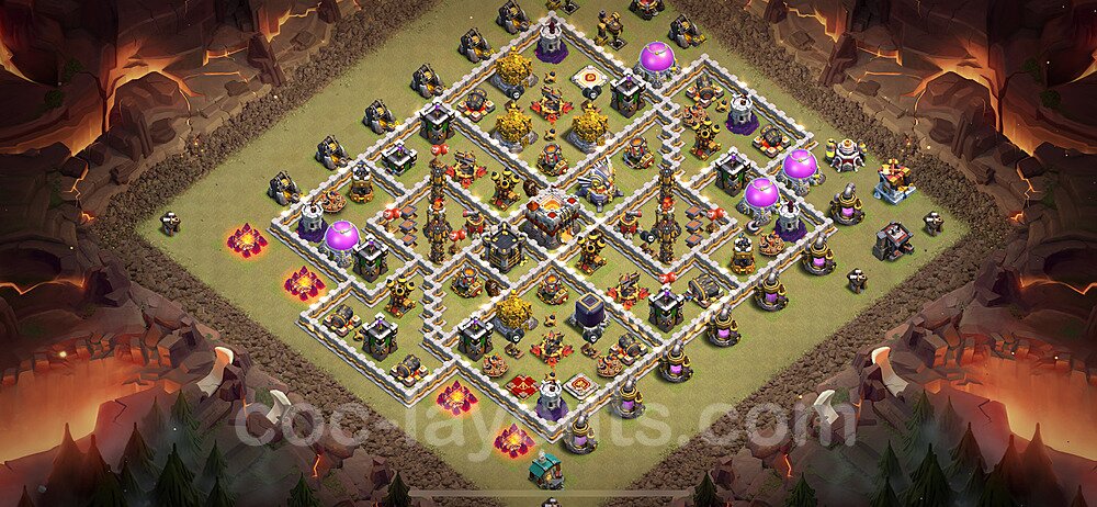 This Town Hall 11 hybrid base offers the best of both worlds - strong resource protection combined with effective trophy defense. The versatile design makes it an excellent choice for players who want to protect their loot while maintaining their trophy count. This balanced approach ensures you don't sacrifice one aspect of defense for another, making it ideal for active players across all league levels. The hybrid layout features centralized resource storages alongside a well-protected Town Hall, with multiple defensive layers that deter both farming raids and trophy pushers. High-value targets are strategically positioned within overlapping defense ranges, forcing attackers to make difficult choices about which objectives to prioritize. The compartmentalized design prevents attackers from easily achieving both loot destruction and the Town Hall kill in a single attack. Defense placement in this hybrid base creates strong coverage against both ground and air attacks. Inferno Towers, X-Bows, and Eagle Artillery work in concert to eliminate threats quickly, while splash damage defenses like Wizard Towers and Bomb Towers counter swarm strategies. The base's funnel-resistant design and strategic trap placement make it effective against popular attack strategies including QC LaLoon (Queen Charge Lava Hound Balloon), Blizzard attacks, and Yeti Smash compositions.