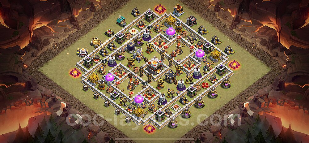 This Town Hall 11 hybrid base offers the best of both worlds - strong resource protection combined with effective trophy defense. The versatile design makes it an excellent choice for players who want to protect their loot while maintaining their trophy count. This balanced approach ensures you don't sacrifice one aspect of defense for another, making it ideal for active players across all league levels. The hybrid layout features centralized resource storages alongside a well-protected Town Hall, with multiple defensive layers that deter both farming raids and trophy pushers. High-value targets are strategically positioned within overlapping defense ranges, forcing attackers to make difficult choices about which objectives to prioritize. The compartmentalized design prevents attackers from easily achieving both loot destruction and the Town Hall kill in a single attack. Defense placement in this hybrid base creates strong coverage against both ground and air attacks. Inferno Towers, X-Bows, and Eagle Artillery work in concert to eliminate threats quickly, while splash damage defenses like Wizard Towers and Bomb Towers counter swarm strategies. The base's funnel-resistant design and strategic trap placement make it effective against popular attack strategies including QC LaLoon (Queen Charge Lava Hound Balloon), Blizzard attacks, and Yeti Smash compositions.